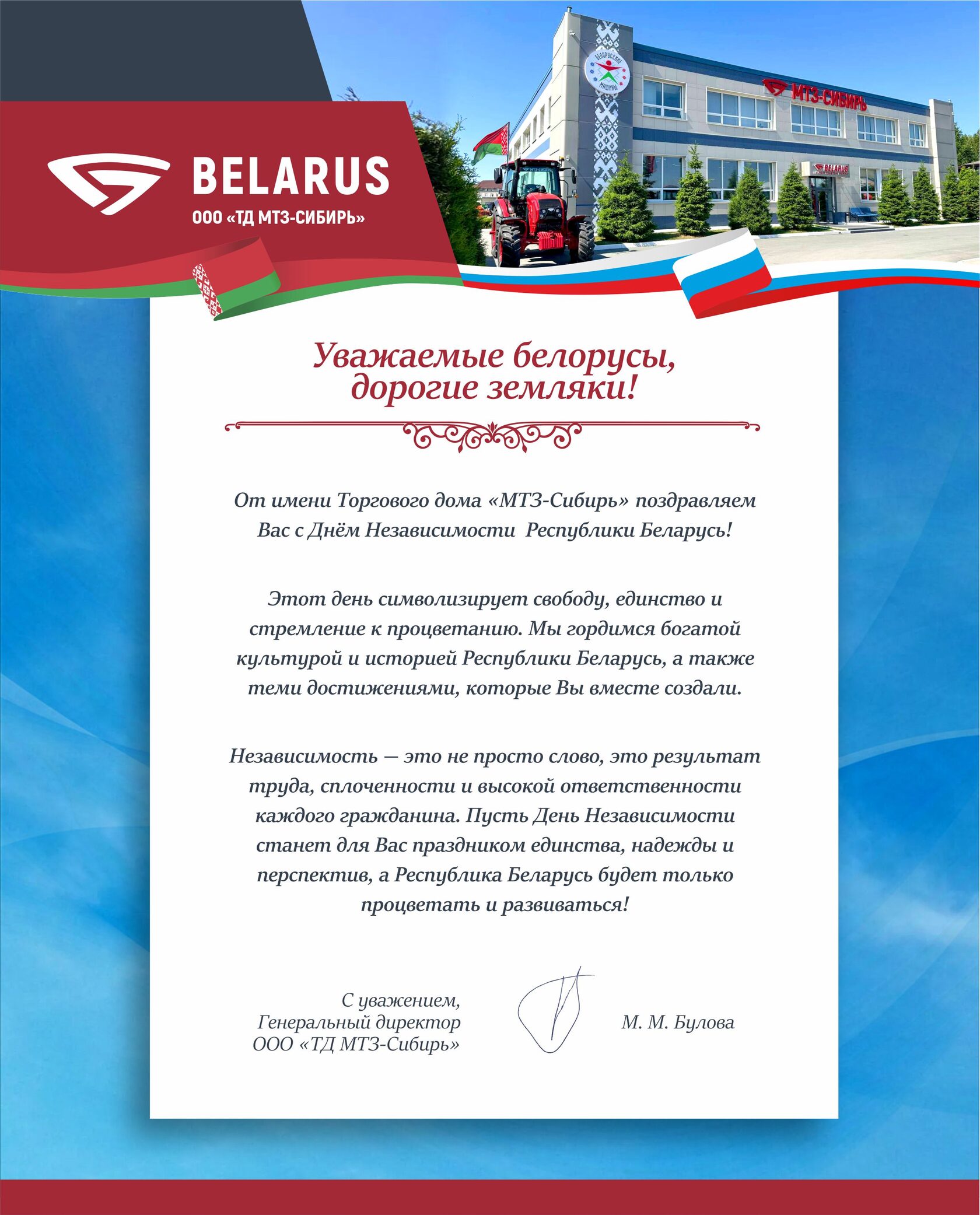 Торговый дом «МТЗ-Сибирь» поздравляет с Днём Независимости Республику Беларусь!