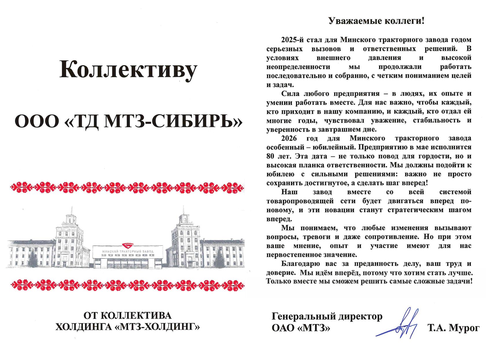 Коллектив Торгового дома «МТЗ-Сибирь» благодарит Генерального директора ОАО «МТЗ» Т.А. Мурога за напутственное обращение.
