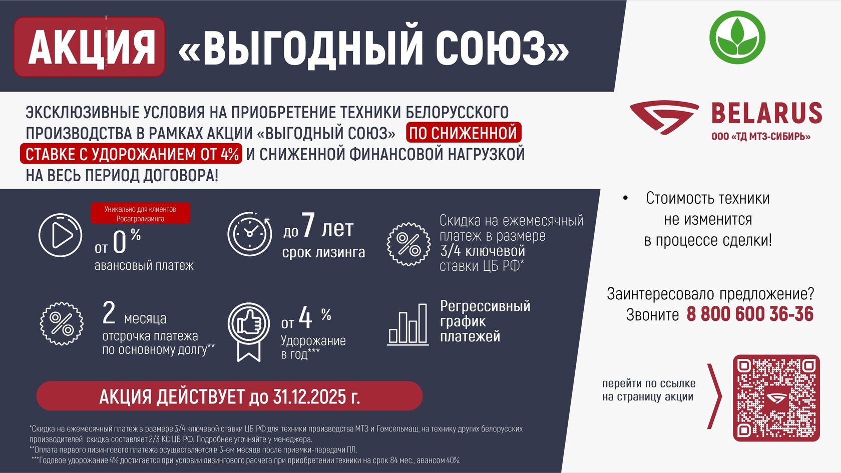 Эксклюзивные условия на приобретение техники белорусского производства без первоначальных вложений и сниженной финансовой нагрузкой на весь период договора – только для клиентов Росагролизинг в рамках акции «Выгодный союз»!